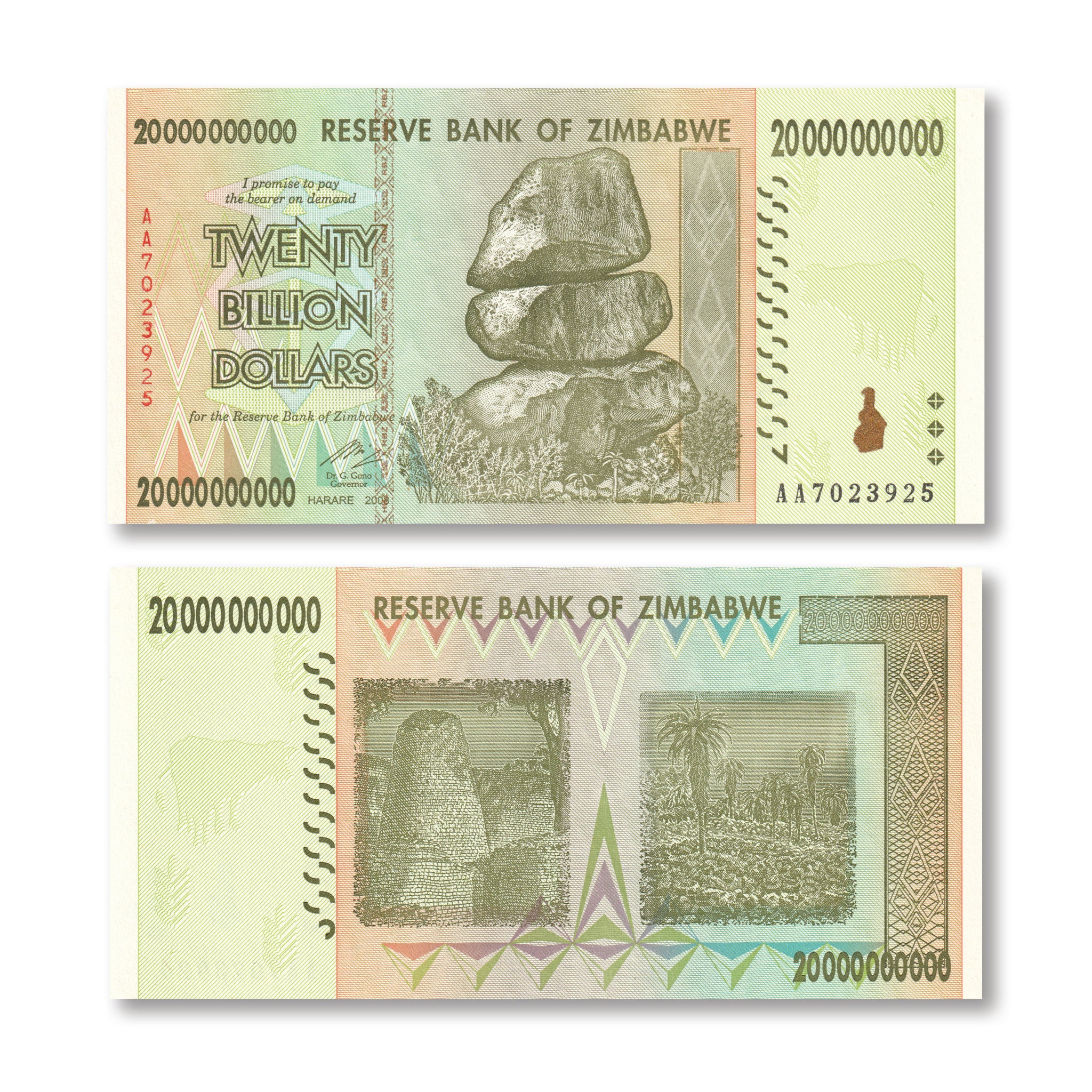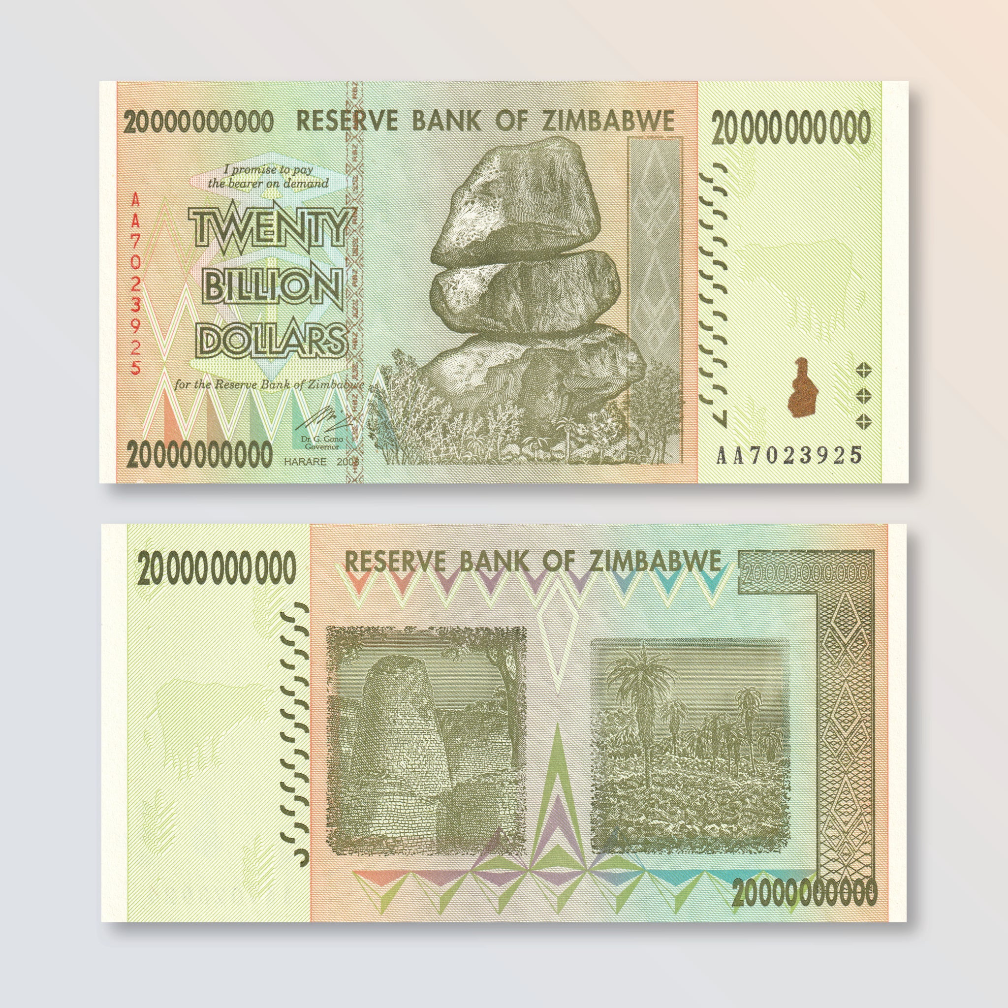 Front: Chiremba balancing rocks in Epworth; stylized grains and cow in underprint; Zimbabwe bird in OVI.